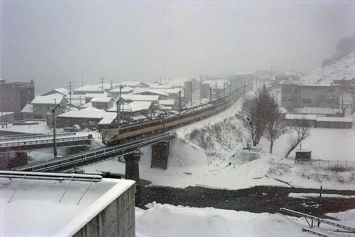 場所が悪く、正面気味でしか撮影できませんでした。「サロンエクスプレス東京」です。予期せぬ列車に嬉しくもあり、場所選定を誤ったことへの無念さもありで、悔いの残る撮影となりました。雪景色の中でEF58に出会ったのは、この時1回きりでした。