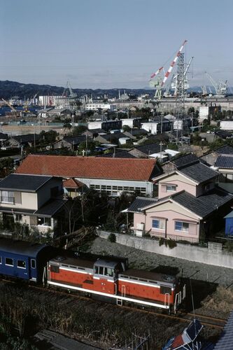 就職しての住まいは会社の独身寮でした。清水には独身寮が二棟ありましたが、私が住まない寮は清水港線に接しておりました。そこで、その寮長に事情を話して寮の屋上にあげてもらいました。 折戸→三保 8:32 661列車 客車も連結した混合列車です。下りの旅客…