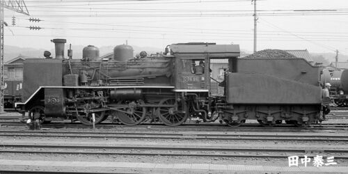 田中 泰三様の画像につき、転載はご遠慮ください。 昭和43(1968)年7月1日 小山機関区 車歴は↓こちら。 C5080 機関車データベース (形式C50) - デゴイチよく走る! キャップ付きの化粧煙突はオリジナル。除煙板は後付け。空気制動は最初から搭載。キャブ周り…