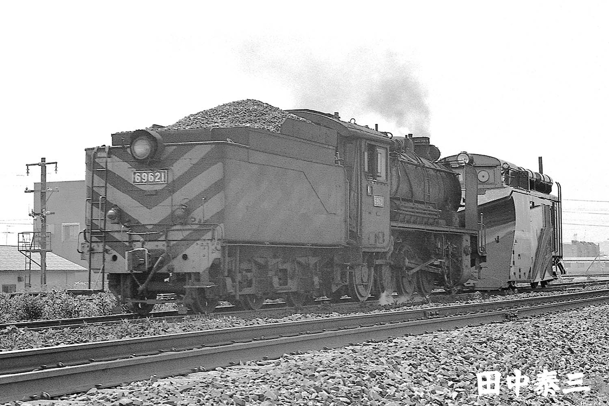 2024-09-04 69621 matuno kura が撮影した画像ではないので、転載はご遠慮ください。 昭和47(1972)年6月18日 鷲別機関区 鷲別区の入換専用機です。炭水車は3面がゼブラ模様。 逆向きで牽引するのはラッセル車のキ550形式でしょうか。 炭水車のステップは、左右とも設置されています。片側だけだったり両側だったりと、地域によって異なっているようです。 除煙板に点検口はありません。 車歴は↓こちら。 http://d51498.com/db/9600/69621